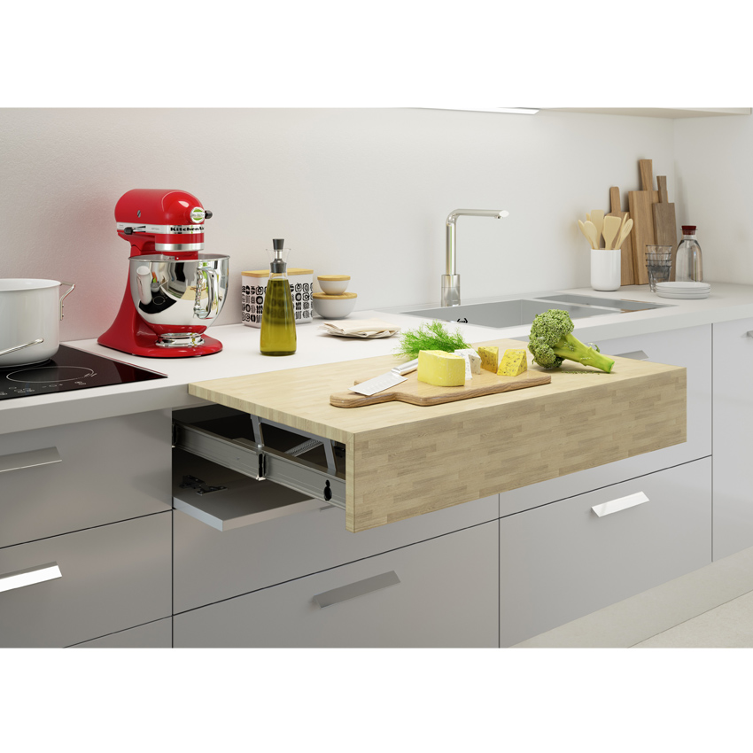 Oplà Top – это система выдвижения дополнительной поверхности из отсека кухонного ящика. Opla Top является очень популярной моделью среди выдвижных механизмов Atim, так как устанавливается на одном уровне со столешницей. Opla Top увеличивает на одном уровне рабочую поверхность кухни, образует дополнительную зону полуострова для легкого завтрака. Экономит место на кухне небольшой площади.
