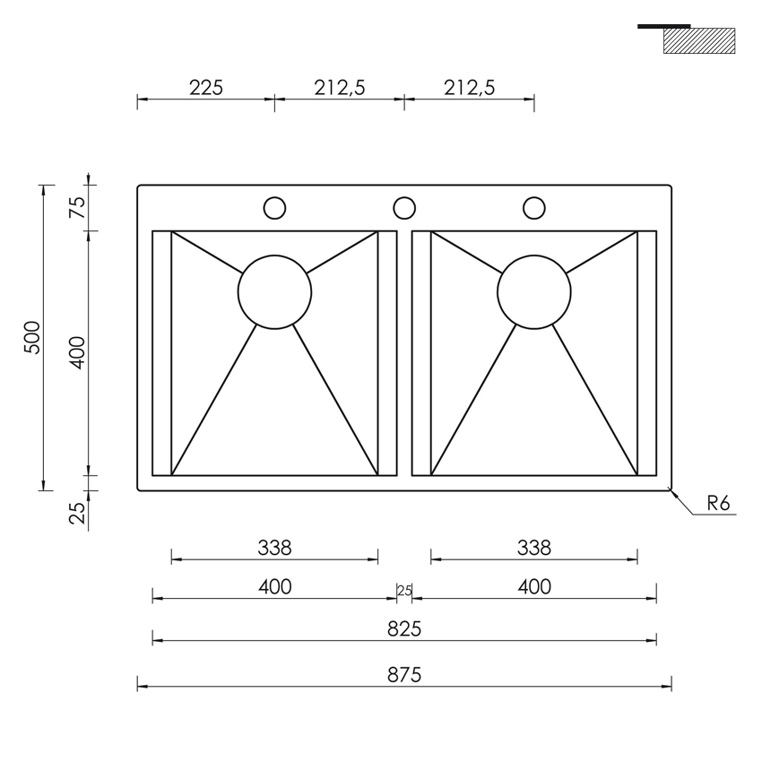 Накладная прямоугольная кухонная мойка CM Focus Mix 87,5X50 2V 15225 из полированной нержавеющей стали с двумя чашами без крыла.