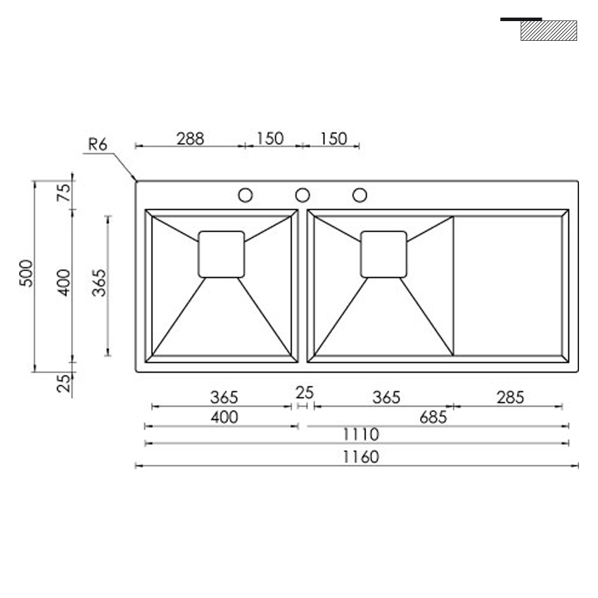 Накладная прямоугольная кухонная мойка CM Glamour Mix 116Х50 2V 12847 из полированной нержавеющей стали с двумя чашами и крылом.