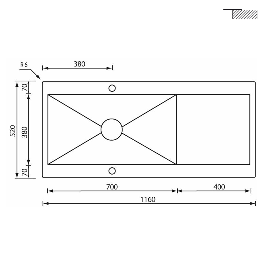 Накладная прямоугольная кухонная мойка CM Revers 116Х52 1V 12989 из полированной нержавеющей стали с одной чашей и крылом.