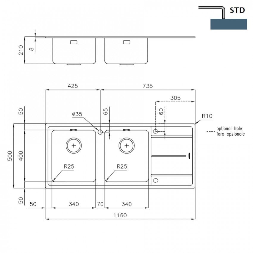 | Особенности модели | отверстие под смеситель, возможность заказать с дополнительным отверстием |