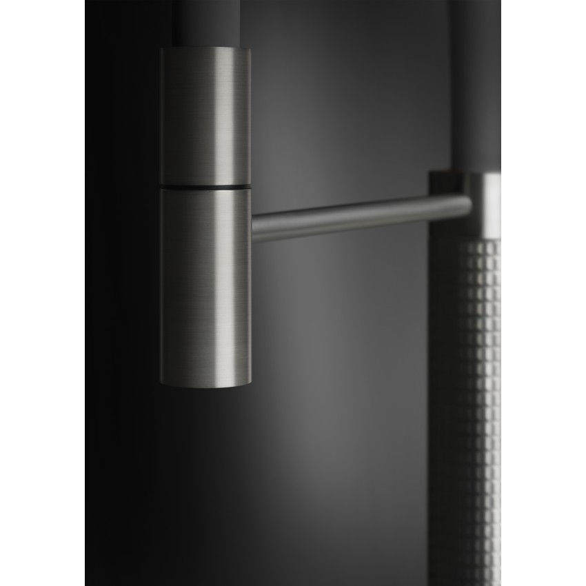Коллекция Gessi 316 Kitchen воплощает гармонию итальянского дизайна и инженерной точности. Модель 60012 представлена в отделке Meccanica — выразительном индустриальном рельефе с чёткими линиями и строгой геометрией. Такая текстура подчёркивает технологичный характер нержавеющей стали AISI 316 и добавляет пространству современную динамику.