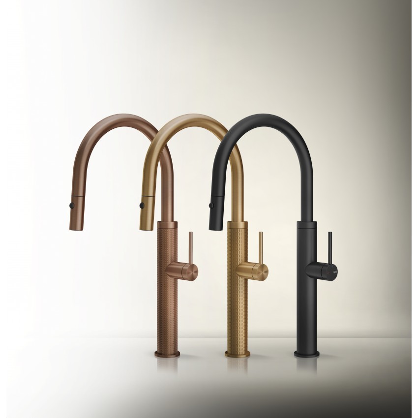 Смеситель в отделке Cesello выделяется изысканным рельефом с утончённым геометрическим узором, создающим выразительную игру света и глубину поверхности. Коллекция выполнена из нержавеющей стали AISI 316 и гармонично сочетает эстетику и функциональность, обеспечивая подачу фильтрованной воды без компромиссов в чистоте и дизайне.