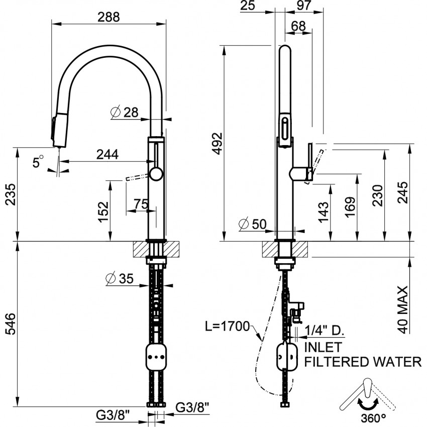 | Особенности модели | угол поворота излива 360°, подключение к фильтру |