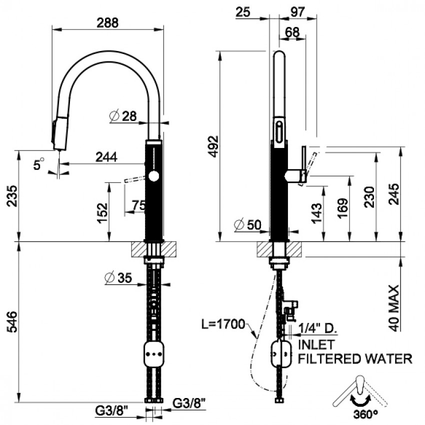 | Особенности модели | угол поворота излива 360°, подключение к фильтру |
