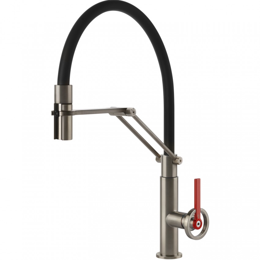Брутальные пропорции корпуса, сочетание металла и тактильных поверхностей создают образ, в котором индустриальный шик соединяется с современным функциональным дизайном. Гибкий излив и различные варианты покрытий позволяют адаптировать смеситель к любому интерьеру — от минималистичного до лофта.