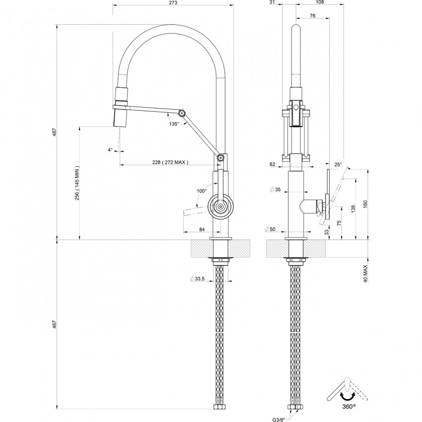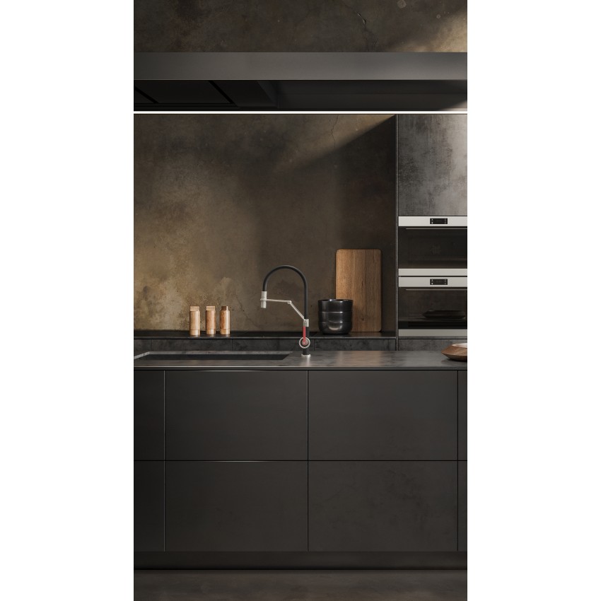 Брутальные пропорции корпуса, сочетание металла и тактильных поверхностей создают образ, в котором индустриальный шик соединяется с современным функциональным дизайном. Гибкий излив и различные варианты покрытий позволяют адаптировать смеситель к любому интерьеру — от минималистичного до лофта.